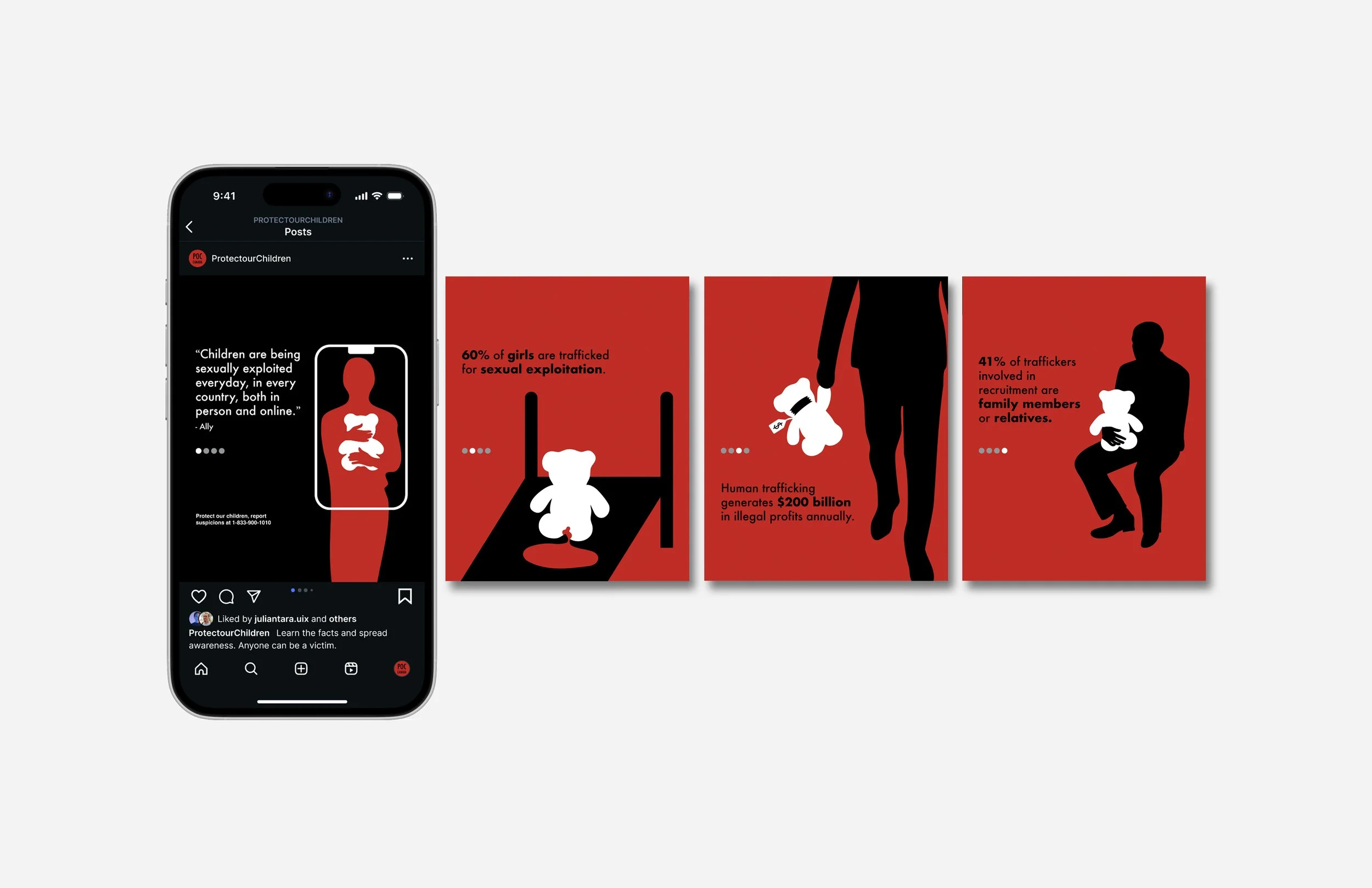 This social justice issue campaign about child trafficking consists of red, black and white to create a sense of urgency and evoke empathy. This high contrast palette paired with simple silhouettes and shocking information is meant to drive immediate awareness, emotional impact, and inspire action against the issue.